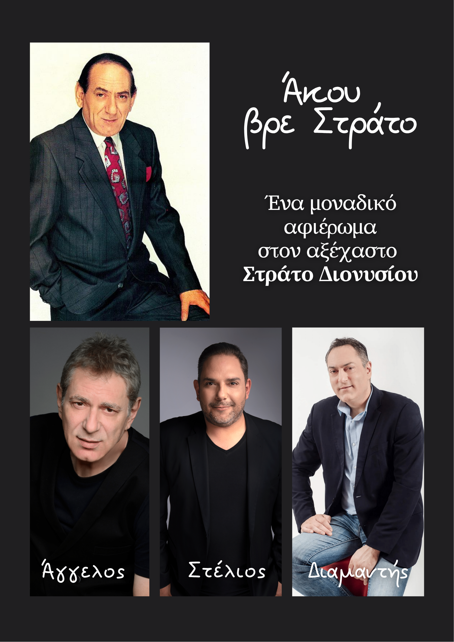 Ένα μουσικό αφιέρωμα στον Στράτο Διονυσίου με τίτλο “άκου βρε Στράτο” που θα παρουσιάσουν οι τρεις γιοι του Άγγελος ,Στέλιος και Διαμαντής για να ερμηνεύσουν τα εμβληματικά τραγούδια του και να μοιραστούν με κοινό τη συγκίνηση της θύμησης του μεγάλου Στράτου Διονυσίου που αποτέλεσε ένα από τα σημαντικότερα κομμάτια της λαϊκής μουσικής σκηνής . Στη συναυλία θα ακουστούν αξέχαστες επιτυχίες, μεταξύ των οποίων «Ο Ξένος», «Βάλε φωτιά στη στράτα μου», «Τα πήρες όλα», <<κράτησε με για πάντα κοντά σου >> αλλά και όλες οι μεγαλύτερες και διαχρονικές επιτυχίες του κορυφαίου λαϊκού τραγουδιστή. Συμμετέχει η τραγουδίστρια Αγνή Καλούμενου καθώς και επταμελή ορχήστρα. Καλλιτεχνική επιμέλεια του προγράμματος αναλαμβάνει ο κορυφαίος μαέστρος Νίκος Στρατηγός . Οργάνωση παραγωγής σχήματος Νίκη Φουσκετάκη