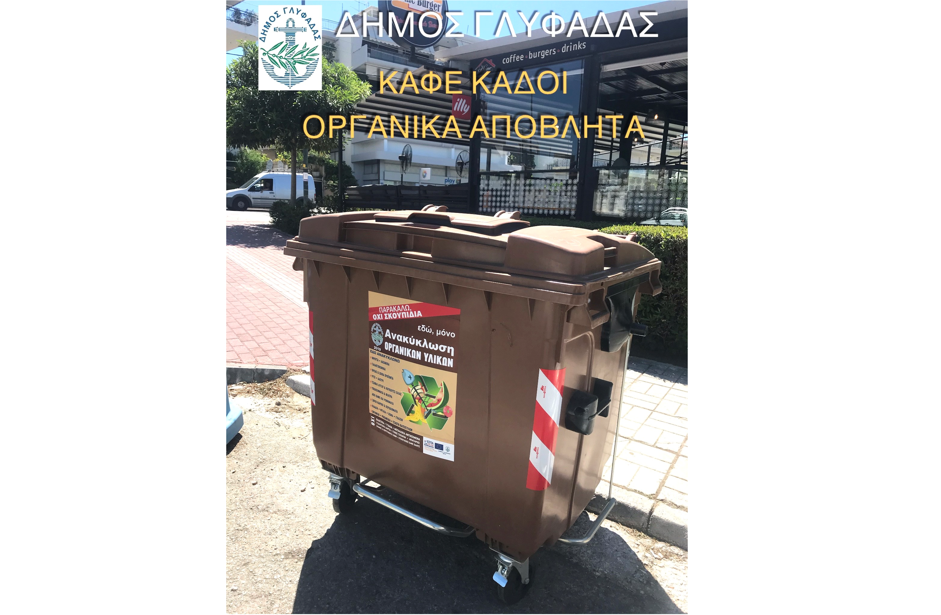 Ο Δήμος Γλυφάδας έχει τοποθετήσει 200 Καφέ κάδους ανακύκλωσης Οργανικών Απορριμάτων σε 162 σημεία σε όλη την πόλη. Σε αυτούς μπορείτε να ανακυκλώσετε: Φρούτα, λαχανικά, γαλακτοκομικά, τροφικά υπολείμματα, κρέας-ψάρι, υπολείμματα και φίλτρα από καφέ, κλαδιά, χώμα, γκαζόν, τσόφλια, πριονίδι, στάχτη καυσόξυλων κτλ.