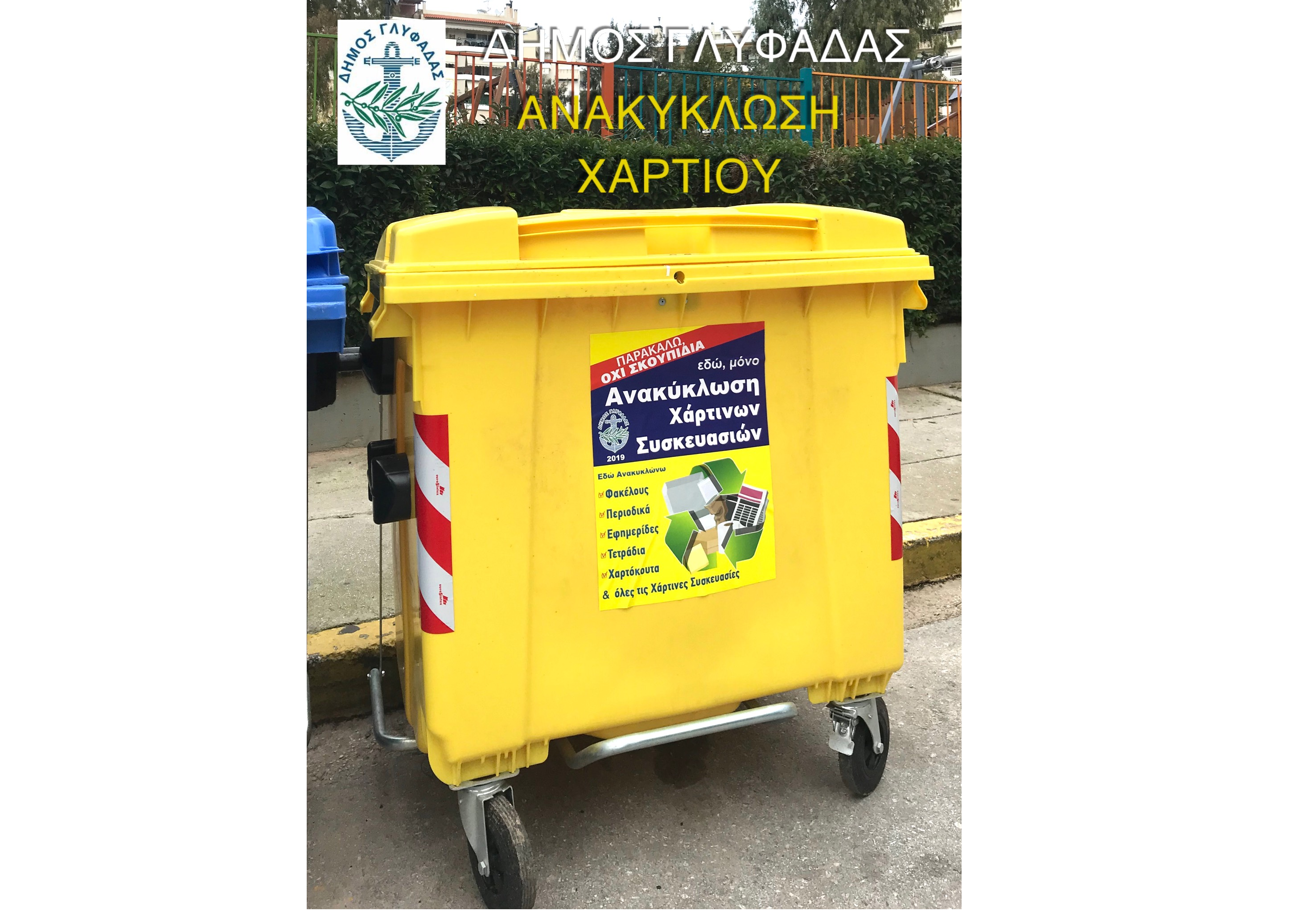 Ο Δήμος Γλυφάδας έχει τοποθετήσει 68 Κίτρινους Κάδους Ανακύκλωσης Χαρτιού σε όλη την πόλη. Σε αυτούς μπορείτε να ανακυκλώσετε: Χαρτόνι, χαρτί
